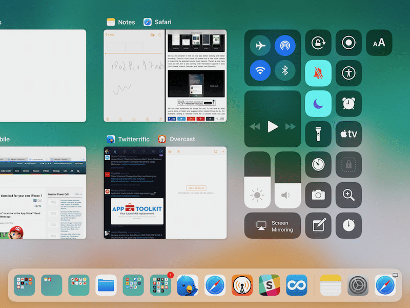 Также в iOS 11 появится принципиально новая система переключения между приложениями, которая объединит приложения, свободное пространство, Центр управления и панель рабочего стола. Проведите пальцем к центру экрана, чтобы запустить её.