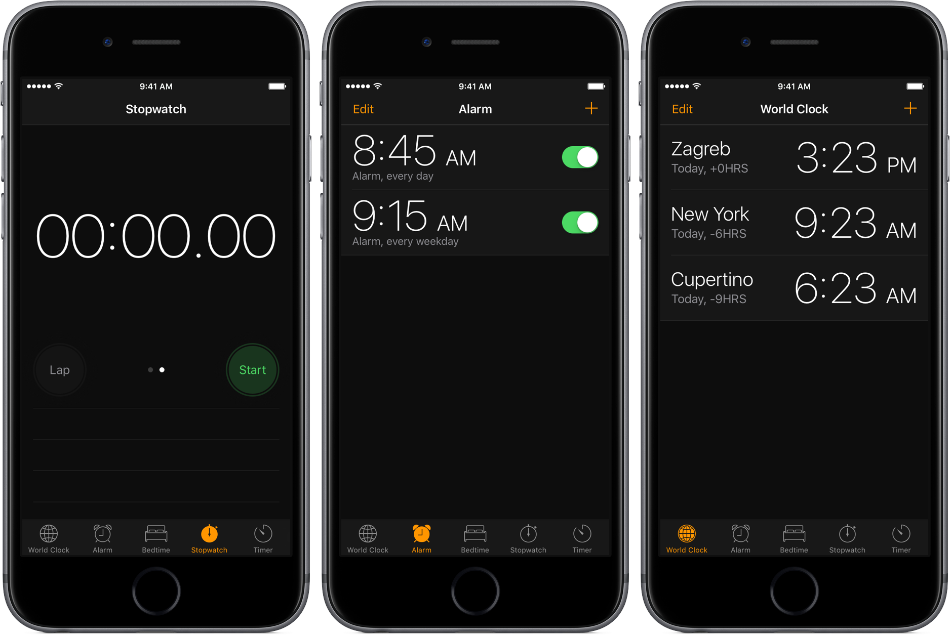 Приложение Часы в iOS 10 также обладает полностью тёмным интерфейсом.
