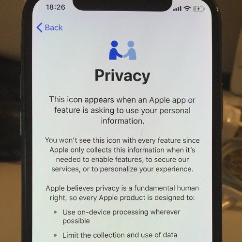 При настройке нового iPhone с iOS 11.3 вы увидите новую страницу Приватность. На ней сказано, что, когда приложение получит доступ к вашим персональным данным, вы увидите специальный значок в статус-баре.