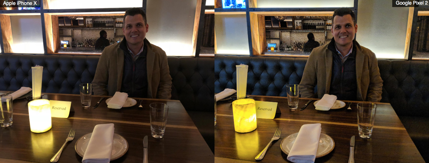 Тем не менее, в условиях недостаточного освещения лучший результат показывает смартфон от Google. К примеру, при съемке в полутемном ресторане iPhone X затемнил лицо человека, но при этом сделал горящую свечу слишком яркой и переэкспонированной. Pixel 2 XL, в свою очередь, и выделил лицо, и сделал детали свечи достаточно контрастными.