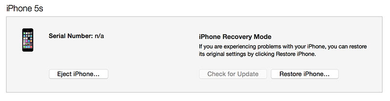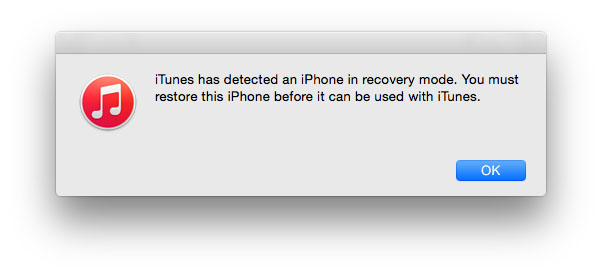 - Отпустите кнопку включения, продолжая удерживать кнопку «Домой», пока не появится всплывающее сообщение iTunes, сообщающее, что устройство находится в режиме восстановления. Если вы не видите сообщение, попробуйте заново выполнить процесс с удержанием кнопок.