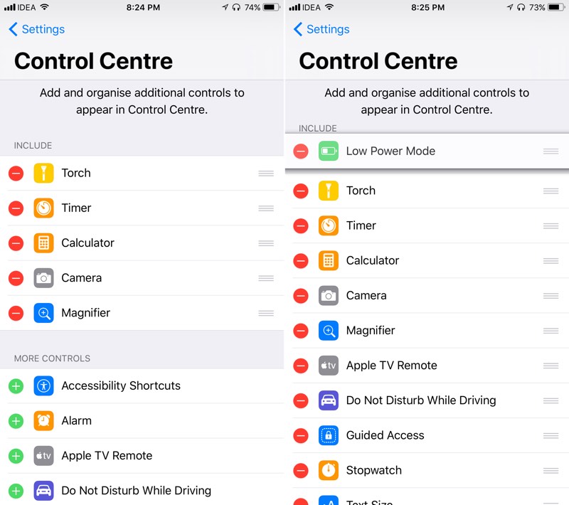 Нажмите на кнопку + чтобы добавить плитку в центр управления. Чтобы удалить элемент, нажмите на кнопку -. Сортировка осуществляется перетаскиванием.