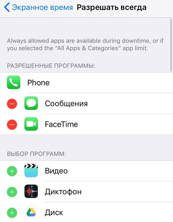 Разрешённые приложения – исключения для всех ограничивающих функций. Если вы добавите приложение в этот список, то сможете пользоваться им даже с режимом Не беспокоить, Downtime и т.д. По умолчанию в списке находятся Телефон и Сообщения, но вы можете добавить в него какие угодно приложения.