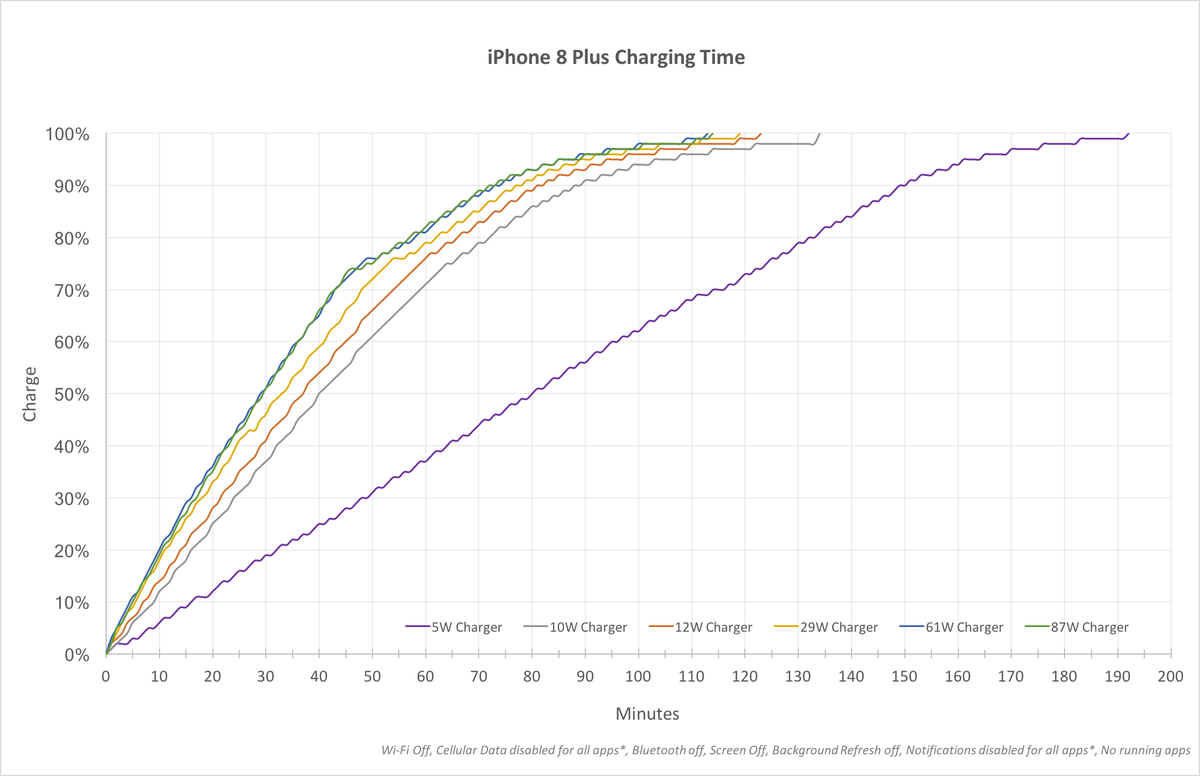 Адаптеру USB-C на 39Вт от Apple нужно полтора часа, чтобы полностью зарядить iPhone 8 Plus. У 5Вт адаптера на это уходит более трёх часов. Если использовать 12Вт адаптер для iPad или порт USB 3.0 на Mac, понадобится всего на 15 минут больше, чем с 30Вт зарядкой USB-C