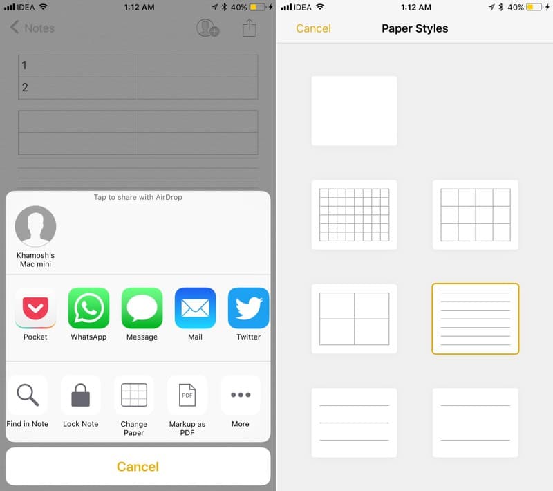 Открыв заметку, нажмите на кнопку Поделиться и выберите Поменять Бумагу. Вы сможете поменять фон на линии, клетку, точки и т.д.