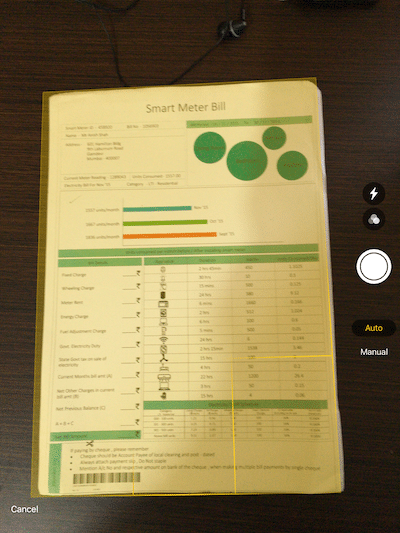 Теперь просто наведите камеру девайса на документ. Устройство проанализирует его сразу же после полного распознания, документ будет просканирован, и вы увидите превью изображения. Это автоматический режим по умолчанию. Чтобы изменить его, нажмите на Manual. Нажав на кнопку с фильтрами, вы можете переключиться на ч/б режим.