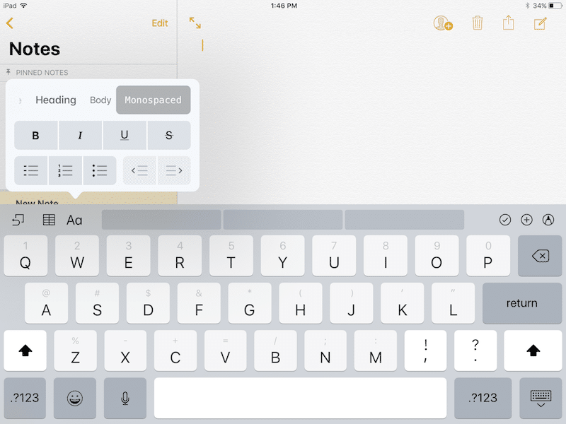 Чтобы выделить ваши записи, вы можете использовать новые опции форматирования. С открытой клавиатурой нажмите на кнопку Aa и сможете изменить шрифт на (новый) Monospaced.
