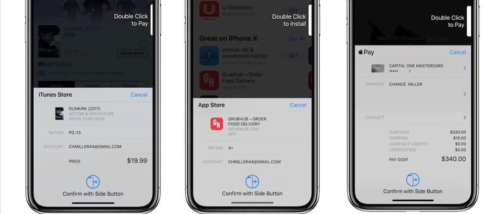 Платежи Apple Pay и App Store на iPhone X совершаются двойным нажатием боковой кнопки. Ранее Apple оповещала об этом статичным экраном, из-за которого многие пользователи думали, что нужно дважды нажать на выделенную область на экране. Из-за этого пользователи часто путались.