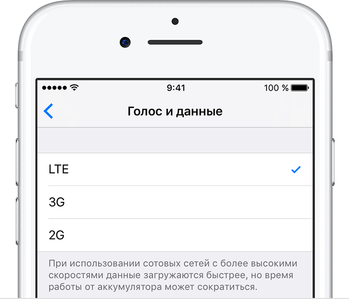 Если вы находить в месте, где плохо ловит связь или отсутствует покрытие LTE, разумным действием будет его отключить и пользоваться 3G. Выберите в настройках пункт «Сотовая связь» > «Параметры данных» > «Голос и данные» и переключитесь с LTE на 3G или, при необходимости, 2G.