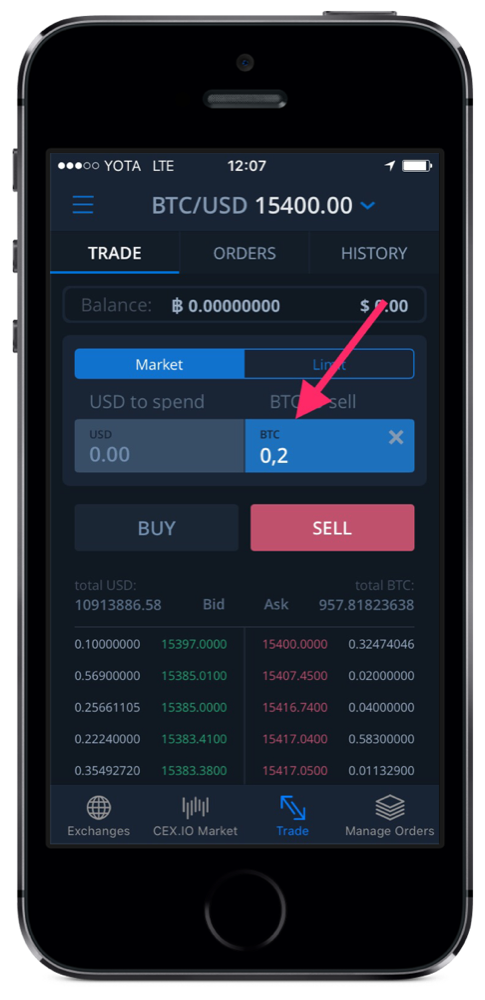 На главном экране приложения в поле BTC to sell введите сумму в биткоинах (BTC) и нажмите «Sell».