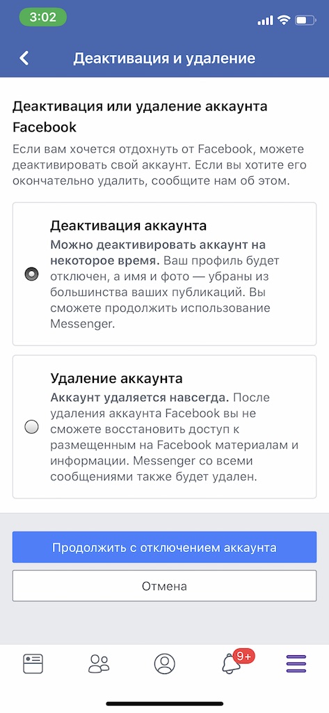 - Тапаем по «Деактивация и удаление» и на следующем экране выбираем нужный способ удаления, либо «Деактивация аккаунта» – это временное удаление страницы в фейсбуке, либо «Удаление аккаунта» – соотвественно удаление аккаунта в фейсбук навсегда. Затем выбираем «Продолжить с … аккаунта».