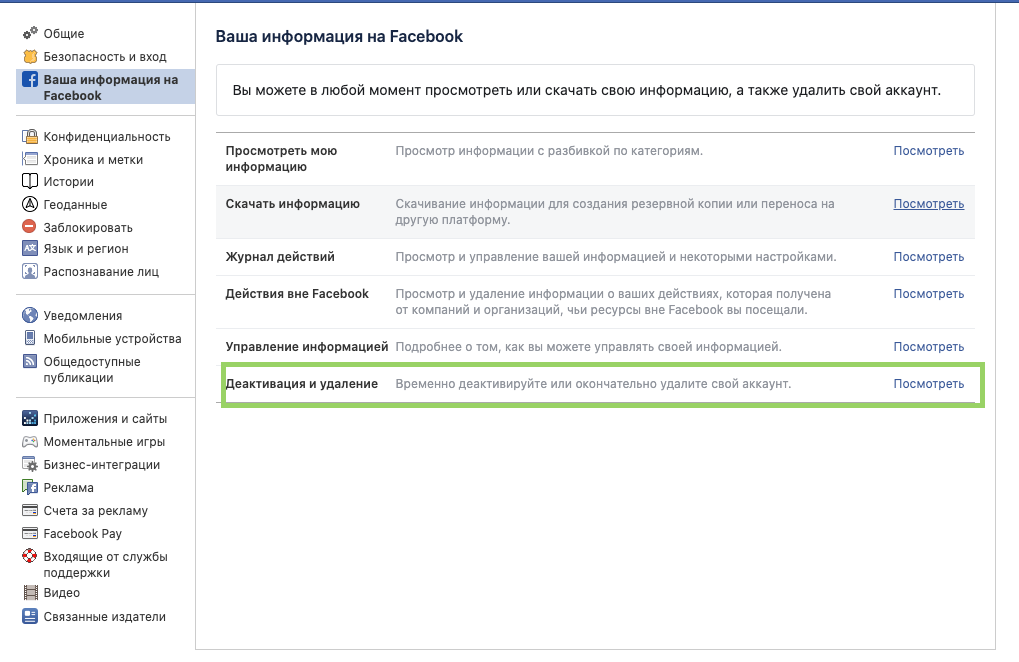 Если вы сочли полное удаление аккаунта слишком радикальным решением, вариант деактивации будет наиболее подходящим. Это более простой и гораздо менее рискованный процесс. Зайдите в настройки, а затем в раздел «Ваша информация на Facebook» по этой ссылке и возле пункта «Деактивация и удаление» нажмите «Посмотреть«.