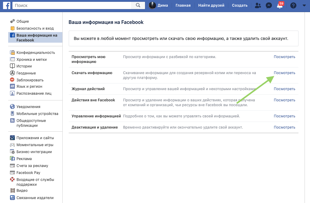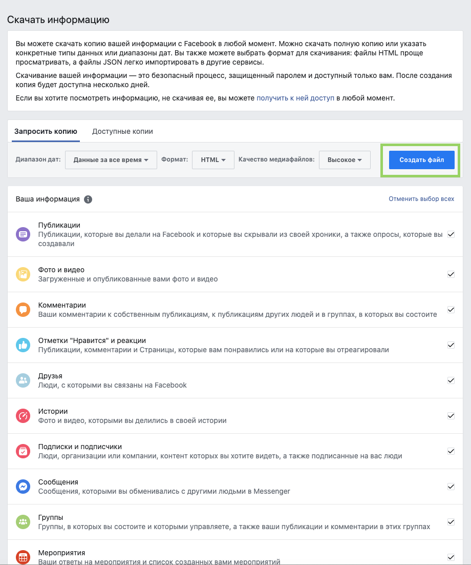 - Сохранить всю свою информацию. Для этого нужно войти в Facebook со своего аккаунта, зайти в меню «Ваша информация на Facebook» по ссылке и нажать «Посмотреть» в разделе «Скачать информацию». На следующей странице нажмите «Создать файл». Это обеспечит возможность при необходимости восстановить данные после того, как вы удалите свой аккаунт в Facebook.