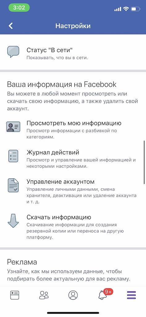 - В настройках пролистайте примерно до середины до раздела «Ваша информация на Facebook«. Здесь перейдем в раздел «Управление аккаунтом«.