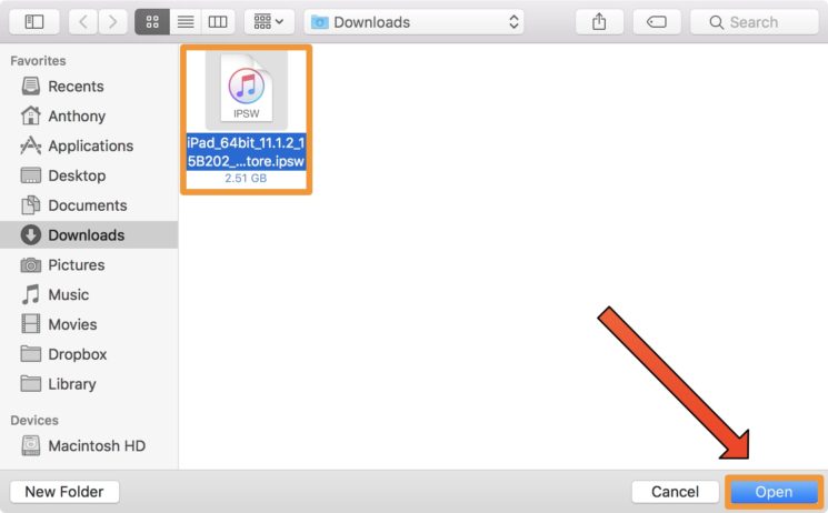 6) Откроется окно программы Finder. Выберите файл прошивки iOS 11.1.2 и нажмите Открыть: