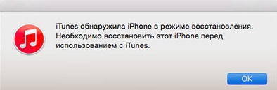 - Отпустите кнопку включения, но продолжайте держать кнопку Home, пока не всплывёт окно iTunes с сообщением об обнаружении смартфона.