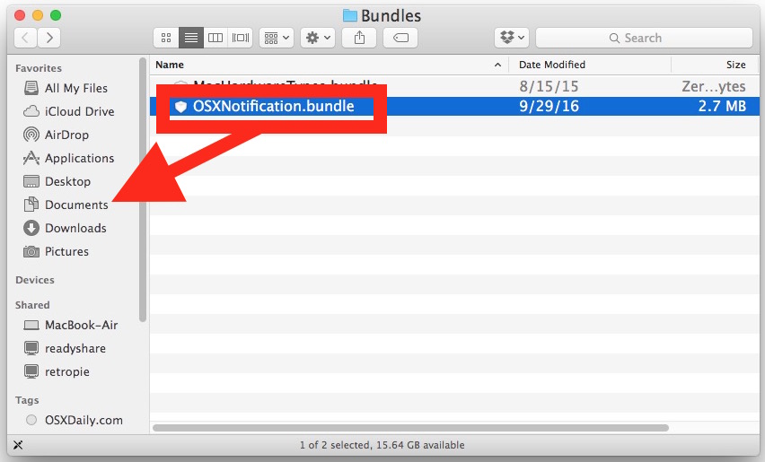 3. Зажмите клавишу COMMAND на клавиатуре и одновременно с этим перетащите файл «OSXNotification.bundle» в другое место. Например, в папку Документы.