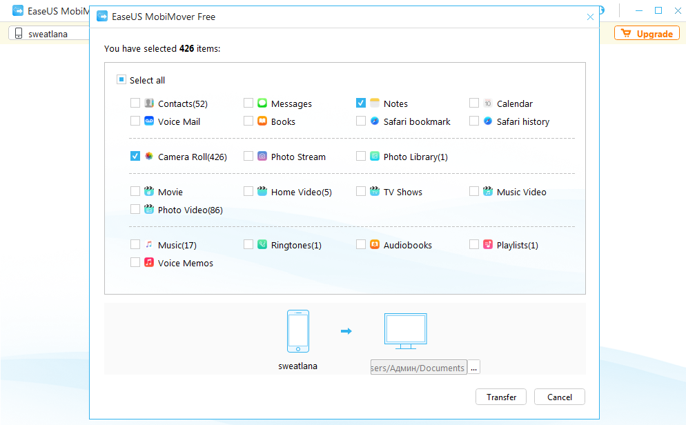 Шаг 3: Выберите один или несколько типов файлов, которые нужно перенести, и желаемое местоположение. Например, «Мои документы» или диск D. После этого нажмите Transfer.