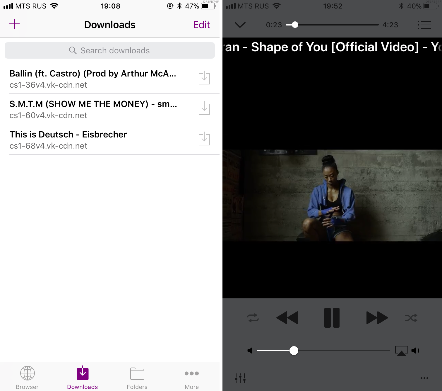 Это приложение имеет такой же принцип работы, как и Музыка ВК, но реализовано всё значительно лучше. Загрузка фото и видео также осуществляется через встроенный браузер, но названия указываются верные, а процесс скачивания отображается в меню «Загрузки», отменить его можно в любой момент. Выбирать качество видео нельзя, как и в предыдущем приложении.