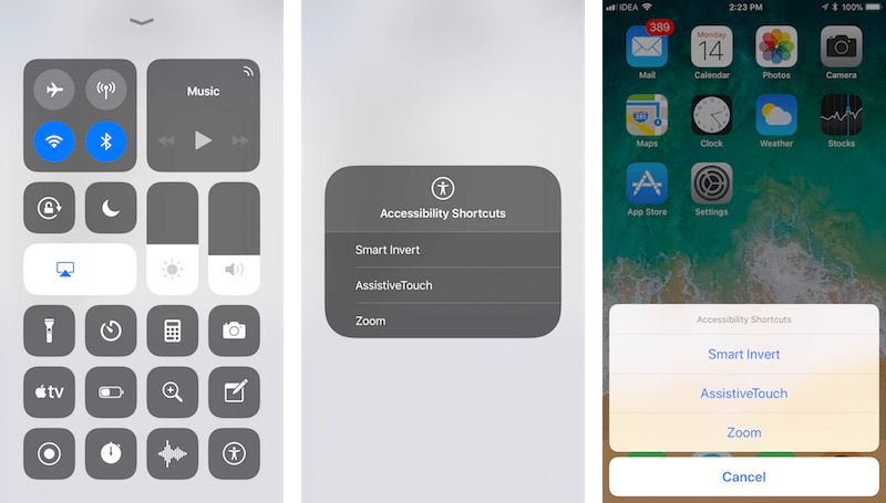 Поскольку это функция универсального доступа, мы можем быстро получать к ней доступ тройным нажатием кнопки «home» или через новый настраиваемый пункт управления.