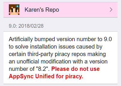 Твик работал без проблем до тех пор, пока не возникла проблема со сторонним репозиторием, в котором кто-то решил опубликовать неофициальную модифицированную версию AppSync Unified. Вот что сказано в приписке к обновлению AppSync Unified 9.0: