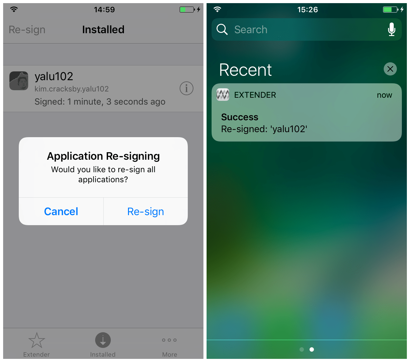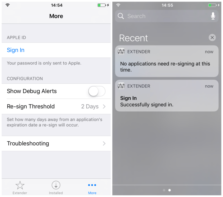 7) Вы должны будете получить несколько уведомлений о входе. Перезапустите Extender, чтобы ваш Apple ID начал в нём отображаться. Убедитесь, что в секции Installed есть приложение вашего джейлбрейка.