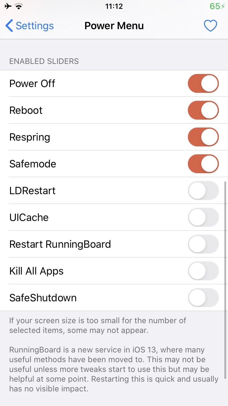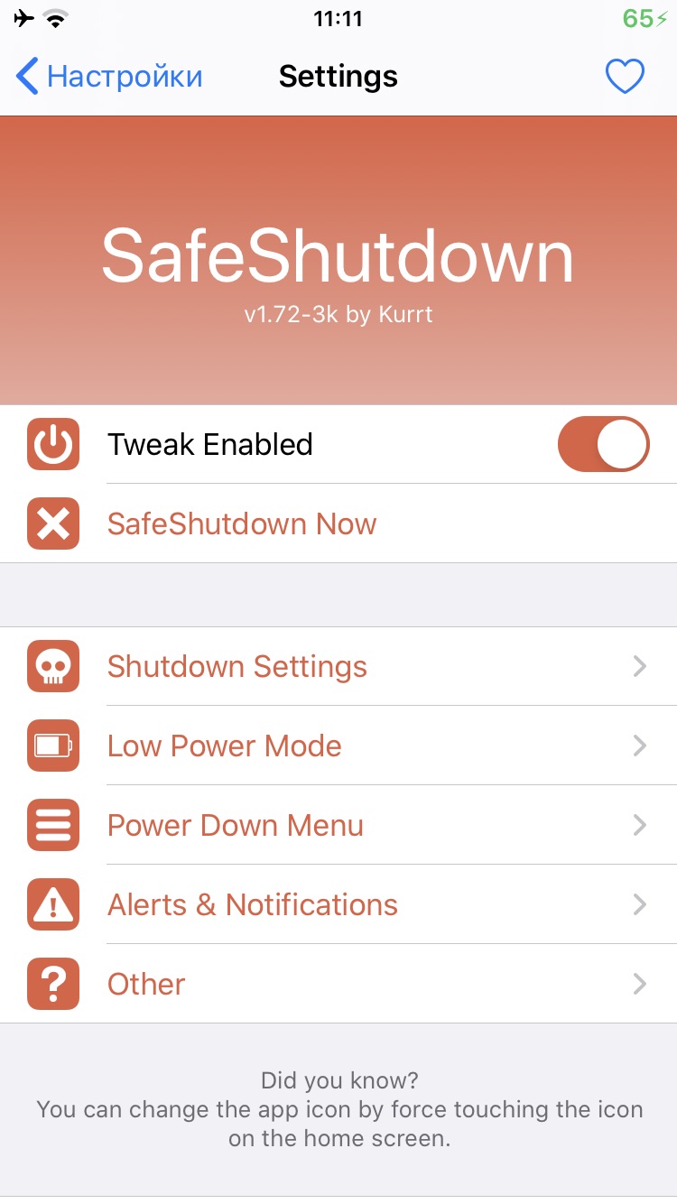 SafeShutdown — это мощный твики, который в первую очередь предназначен для безопасного отключения телефона, то есть чтобы вы могли выключить телефон и при этом не потерять джейлбрейк. Твик добавляет псевдовыключение на устройство, убавляя все ресурсы телефона на минимум. Ну и собственно в этом твики есть возможность добавить кнопку респринга в стандартное меню выключение iOS-устройства, либо вызвать респринг через приложение SafeShutdown, которое появляется на домашнем экране.