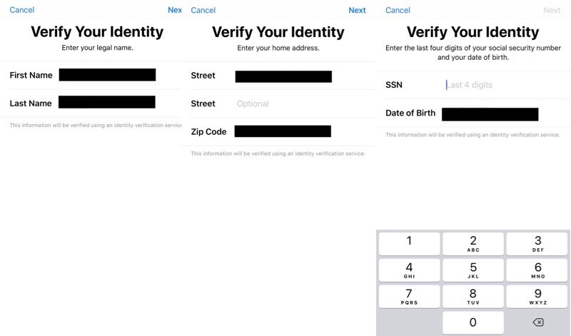 На изображениях ниже показан процесс настройки функции. Apple Pay Cash требует имя, адрес и даже номер страховки.