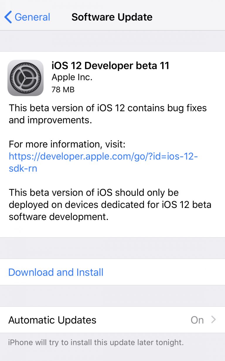 Сегодня Apple официально выпустила одиннадцатую бета-версию iOS 12 для разработчиков. Обновление вышло спустя всего пару дней после выхода десятой беты. Кроме того, вышли новые бета-версии macOS Mojave и tvOS 12.