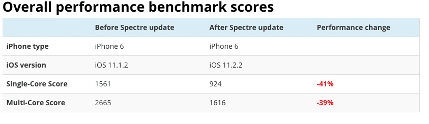 В отличие от других уязвимостей, патчи Meltdown и Spectre могут влиять на производительность устройств. В своём официальном заявлении Apple ничего не сказала о замедлении процессоров, но оно неизбежно. Apple обновила систему безопасности в версии iOS 11.2.2.