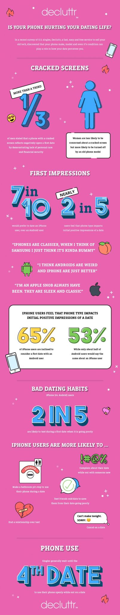 Если вы хотите встречаться с владельцем iPhone, стоит учитывать их плохие привычки. К примеру, 2 из 5 владельцев iPhone будут ходить в туалет посреди свидания, чтобы воспользоваться смартфоном, или вообще отменят ваше свидание. Также существует вероятность в 40%, что на свидании они будут жаловаться паре на кого-то другого и прервут ваши отношения SMS-сообщением.