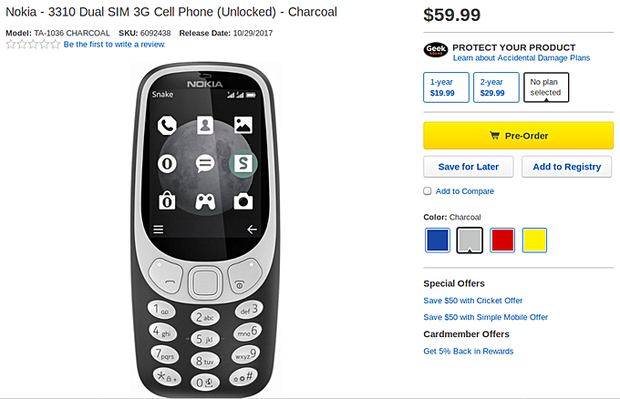 Предзаказы на Nokia 3310 начались и в США. На веб-сайте Best Buy этот телефон с двумя SIM-картами продаётся за 60 долларов. Доставка устройств должна начаться 29-го октября. Модель доступна в четырёх цветовых вариантах.