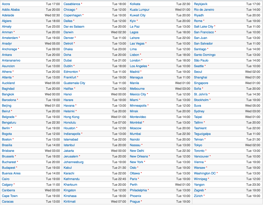 Если вы не нашли своего города в списке, можете воспользоваться сайтом TimeandDate.